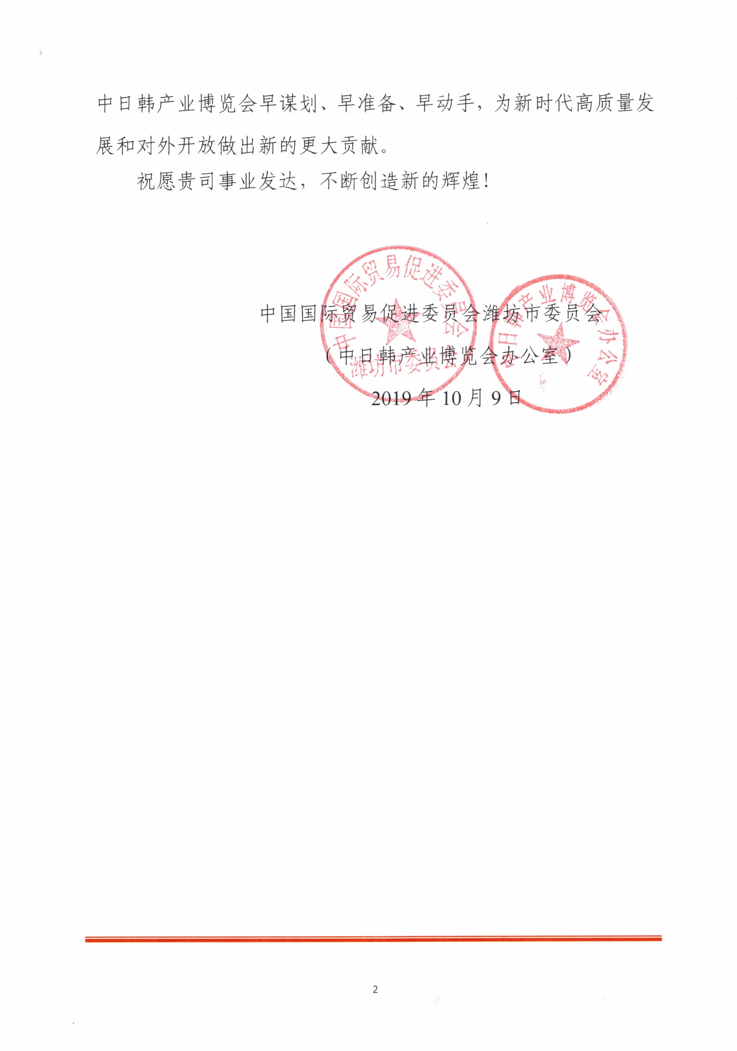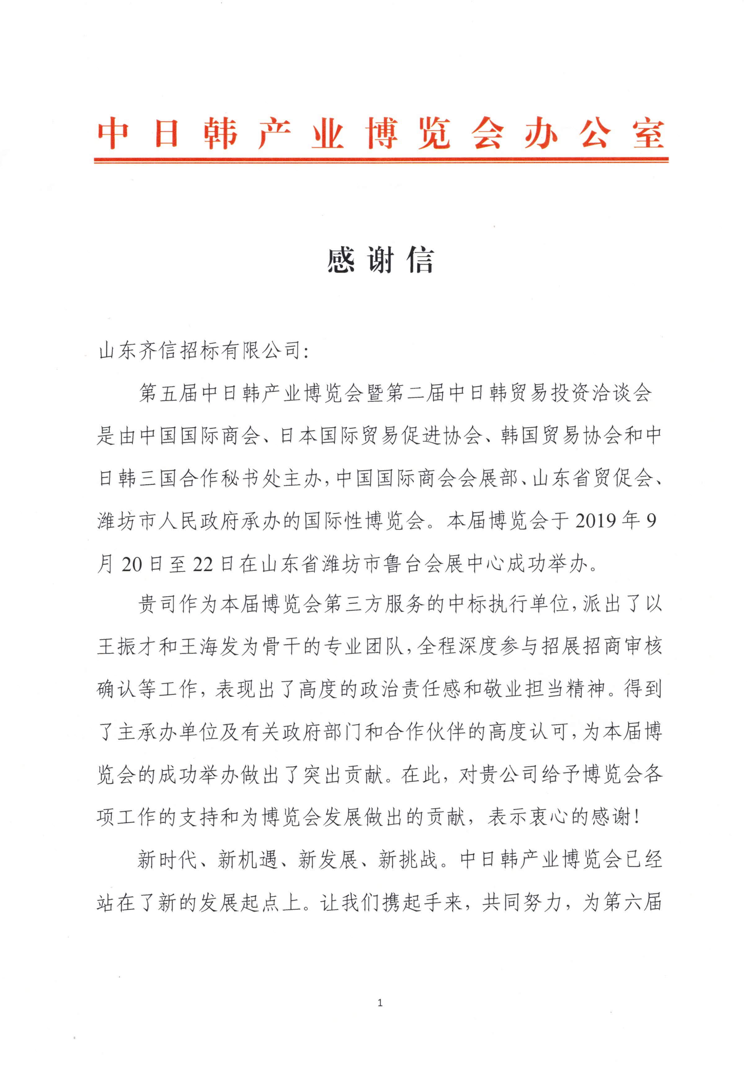 日前,齊信收到來自中日韓產業博覽會辦公室發來的感謝信,對齊信給予博覽會各項工作的支持及付出的努力表示衷心感謝。9月22日,第五屆中日韓產業博覽會暨第二屆中日韓貿易投資洽談會圓滿落幕。齊信作為本屆博覽會第三方服務的中標執行單位,全程深度參與了招展招商審核確認等工作。齊信專業的服務團隊和敬業擔當精神得到了主辦單位及有關政府部門的高度認可。