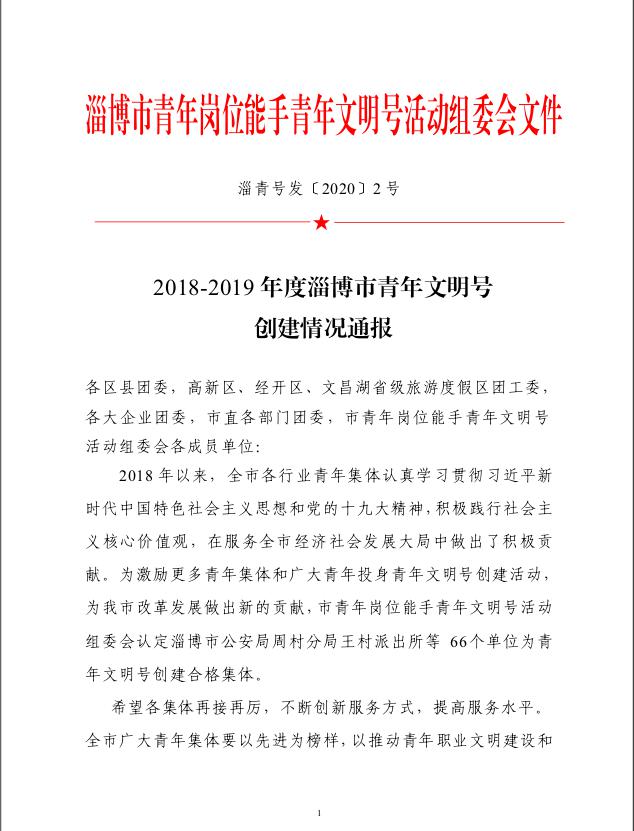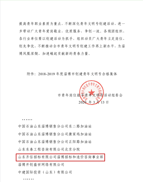 近日,共青團淄博市委下發《2018-2019年度淄博市青年文明號創建情況通報》(淄青號發【2020】2號),山東齊信招標有限公司淄博招標采購與造價咨詢事業部榮獲淄博市“青年文明號”榮譽稱號。