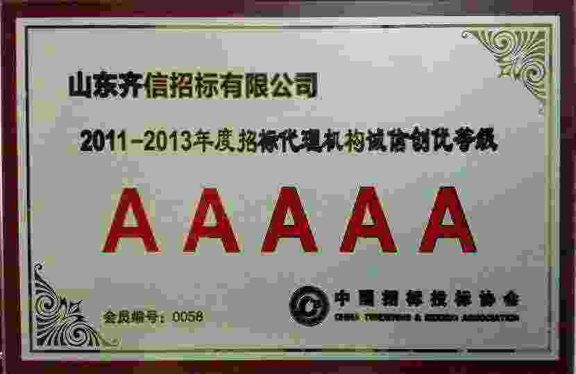 在中國招標投標協會組織開展的“2011-2014年度招標代理機構誠信創優”活動中,通過協會嚴格審核把關,山東齊信招標有限公司在全國近千家招標代理機構中脫穎而出,獲得“5A”等級,這是公司自2010年起聯系第三次參加協會誠信創優評選,均獲得最高等級,凸顯了公司在國內同行中的較高水平和行業地位。