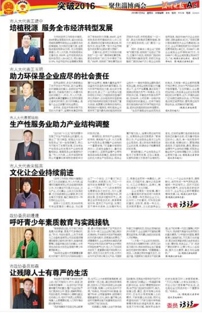 2016年1月16日、17日,第十一屆淄博市政協委員會第五次會議、第十四屆人大五次會議相繼召開。董事長郭培勛作為市人大代表、總經理王俊作為市政協委員分別參加了會議。會上,公司董事長郭培勛接受淄博晚報專訪,結合“十三五”規劃綱要,提出了“產業性服務業不能為了發展而發展,應當從高度、長度和深度三方面進行合理規劃。首先,應該把淄博打造成商務咨詢服務區的魯中總部,成為魯中服務區的中心。其次,單一性的服務市場比較差,規模也較小,要強調鏈條服務,打造服務鏈。最后,要結合淄博市產業結構的調整,把服務業融合到產業結構調整之中,讓服務業更有價值”的建議。