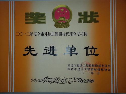 最近,在濰坊市建設工程招標投標協會組織的2012年度先進單位和個人評選活動中,我公司濰坊分公司榮獲“2012年度全市外地進濰招標代理分支機構先進單位”稱號,高偉九同志被評為“2012年度全市招標代理工作先進個人”。這是濰坊市建設工程招標投標辦公室與建設工程招標投標協會根據2012年度招標代理機構定期考核結果和實際工作情況評選的,全市共評出8家單位為外地進濰招標先進分支機構。