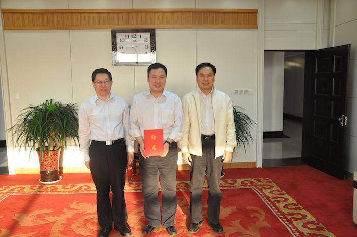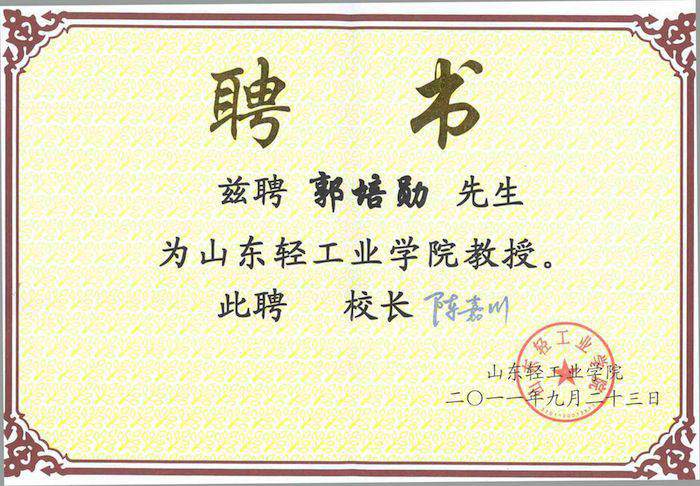 九月二十三日,我公司董事長郭培勛先生(中)受聘山東輕工業學院教授聘書頒發儀式在學院會議廳舉行,山東輕工業學院校長陳嘉川(左)親自為郭培勛先生頒發聘書,院黨委書記徐同文(右)出席了聘書頒發儀式。