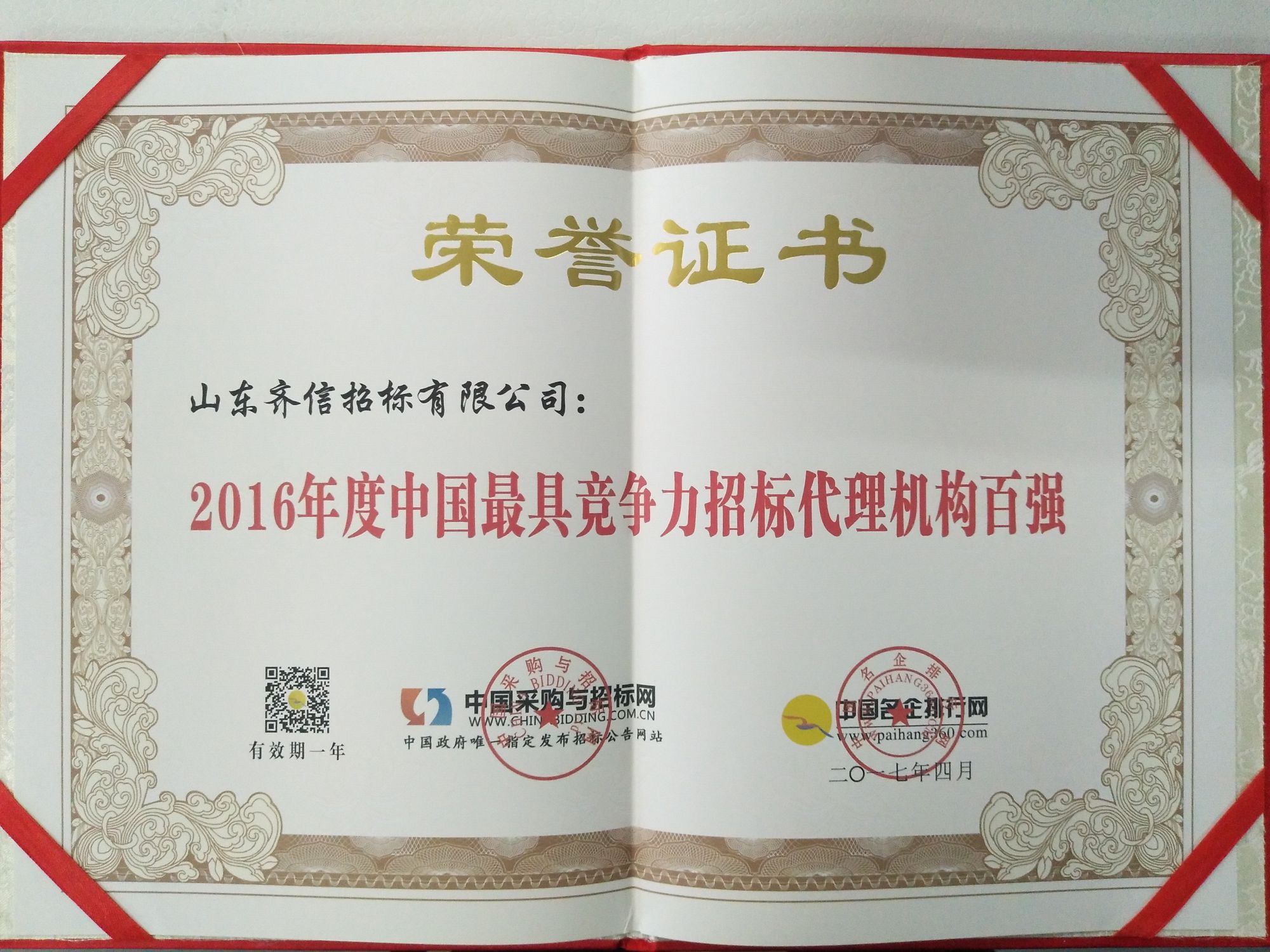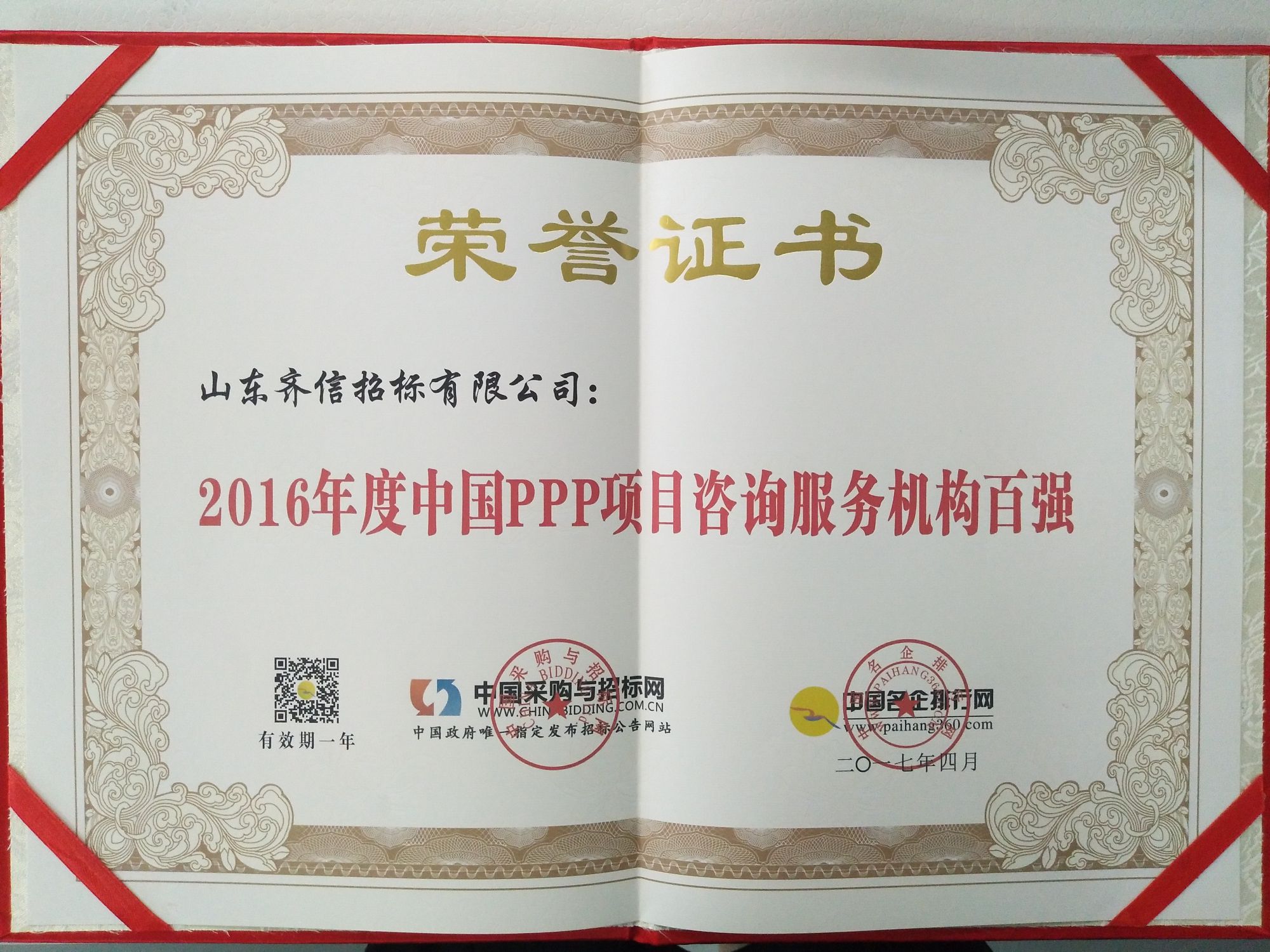 日前, 2016年度中國最具競爭力招標機構百強及2016年度中國PPP項目咨詢服務機構百強在京正式揭曉,山東齊信招標有限公司分別位列第29名和第30名。